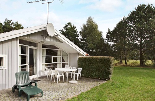 Layout: open kitchen(cooker(electric), hood, coffee machine, microwave, dishwasher, fridge(+ freezer), washing machine), Living/bed room(TV(satellite, german television channels, danish TV channels (DR1 and TV2)), DVD player, CD player, stereo unit), bedroom(double bed, children's bed), bedroom(double bed), bedroom(4x bunk bed), bathroom(bathtub or shower, washbasin, toilet), Bubble bath(indoor, heated, 2 persons), sauna(indoor, heated, 3 persons), heating(electric), terrace, BBQ, play equipment, air to air heatpump