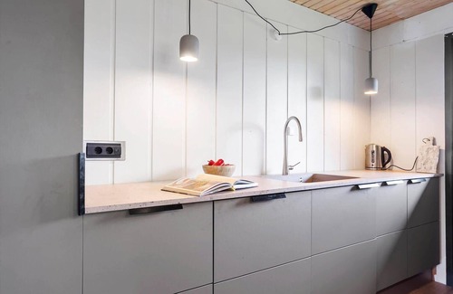 The kitchen is equipped with a stovetop, a refrigerator, and a dishwasher, as well as a coffee maker. And because there's a washing machine, you can go a bit lighter on your packing. Other amenities include an ironing board and a dining table.