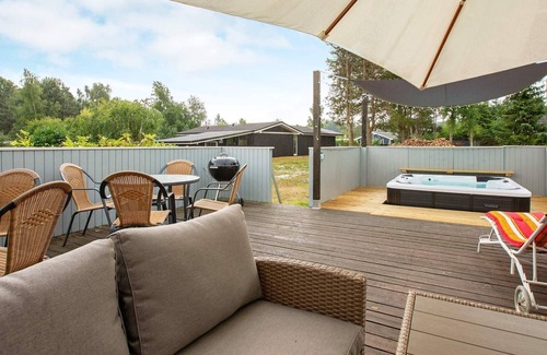 Layout: Kitchen(cooker(electric), hood, coffee machine, microwave, dishwasher, fridge(+ freezer)), Living/bed room(TV(cable, german television channels, danish TV channels (DR1 and TV2)), DVD player, CD player, stereo unit, high chair), bedroom(double bed, children's bed), bedroom(double bed), bedroom(2x single bed), bedroom(single bed, 2x bunk bed), bathroom(floor heating)(tumble dryer, bathtub or shower, washbasin, toilet, washing machine), bathroom(floor heating)(washbasin, toilet), carport, game computer, Bubble bath(indoor, heated, 2 persons), Bubble bath(outside, heated, 6 persons), heating(electric), terrace, BBQ, table football, darts, air to air heatpump
