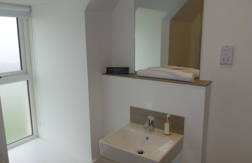 This stylish bedroom features a modern en-suite bathroom with a shower and has beautiful contemporary wooden floors. The windows allow guests to enjoy far-reaching partial views of the dramatic John O'Groats coastal scenery.