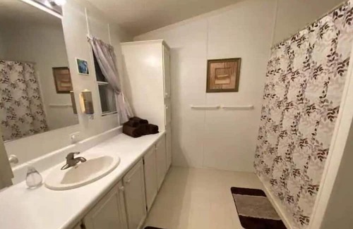 Walking through the front door you enter a large, open living room furnished comfortably with two overstuffed leather chairs and accompanying ottomans, a double rocking recliner, and a small rocking chair. Fully functional Kitchen/dining to left. Master bedroom/ bath to on one side, two bedrooms and 2nd bathroom to the right. Laundry/ storage off kitchen.