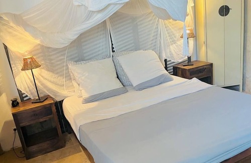 Bungalow with 2 bedrooms, one air-conditioned and the other ventilated, Balinese bathroom, pool house (consisting of an equipped kitchen, a bar, a dining area, a lounge to relax) .Magnificent green setting on the edge of a large salt pool. The pool is to be shared with the owner. The entrance to the rental is independent. Close to the beaches, the lagoon and various activities (golf, diving, boating, parachuting, hiking...) Booking conditions: Children must know how to swim - We prefer not to accommodate young children. When making your reservation, please confirm the age of your children in writing.
