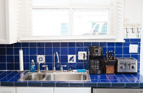 The foundation is laid for you to fill your evenings with great food, warm laughter, and magical moments together in the kitchen, which is fully equipped with cookware and tableware. Take advantage of the microwave, full-size Stainless refrigerator with freezer and ice maker, coffee maker, toaster, and LG Stainless steel oven for making your favorite meals. Additionally, there are other appliances available, including an air fryer, Instapot, blender, baking dishes, broiler, food scale, and mixing bowls. Enjoy the updated LG Stainless steel dishwasher as well. The kitchen features bright blue tile accented with local SHEARWATER POTTERY tiles, which gives it a unique coastal design and feel.