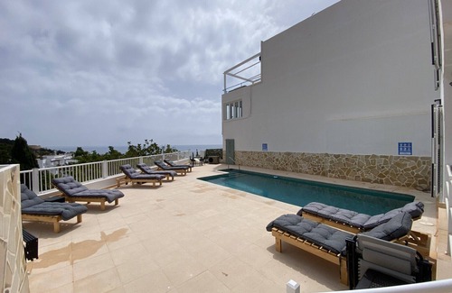 Rooftop Terrace with stunning views. Amazing pool area, 8m x 4m pool and comfortable sun loungers.