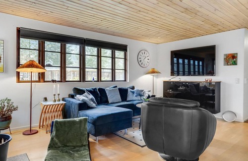 The authentic wooden house is ideal for one or two families with pets who want to spend a relaxing vacation together in Djursland. You step into a cozy and welcoming vacation home. Here you can make yourself comfortable with a warming fireplace or a glass of wine in the living room. Thanks to the many windows, an incredible amount of light enters the room, which adds to the natural flair. On the open and partially covered terrace with garden furniture and barbecue, it is wonderful to spend a barbecue evening or a delicious breakfast.