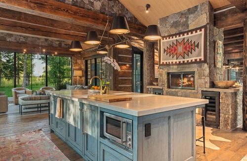 The main house features four king bedrooms and one 2 queen bedroom each with ensuite bathrooms and outdoor access with luxurious touches, while three historic cabins provide added comfort, privacy, and unique character. Rare for Jackson Hole, the property's four dwellings were grandfathered in under Teton County guidelines, giving it the feel of a mini ranch rather than just a single home.