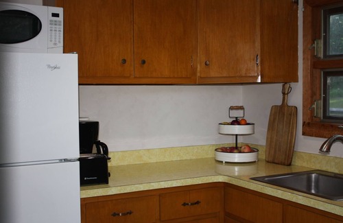 Fully equipped kitchen with new floor and paint, plenty of good quality cookware and utensils, new microwave and fridge, plus a coffee maker and toaster.