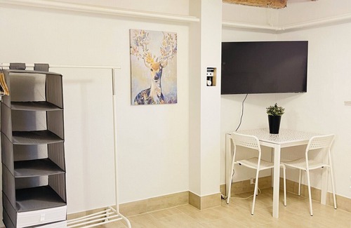The room is big enough for 2 guests and has a double bed and a bathroom with a nice shower. There is a modern big screen smart TV*, which is located next to a little round table with 2 chairs. There are also basic cooking appliances available in the kitchen.
