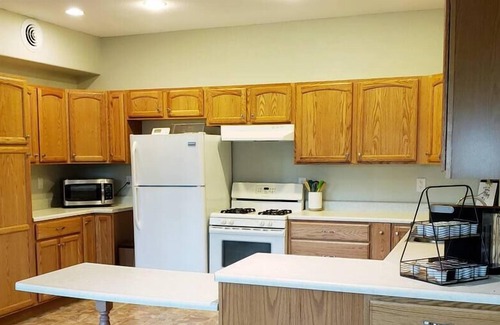 Kitchen: Fully furnished kitchen with a refrigerator, stove/oven, microwave, dishwasher and coffee maker, mixer and popcorn popper, along with pots, pans and utensils on the main floor. The 2nd level has no stove top, only a countertop convection oven, large enough to fit 2 large pizzas. There is a full size fridge, a microwave, and a Keurig coffee maker.