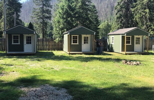 Stay comfortably upriver at this cute and cozy dry cabin. Experience the cool mountain air and the lazy river with wildlife abounding during your stay. The cabin features a delightful queen bed, ensuring a cozy night's sleep. With AC and heating available, guests can stay comfortable no matter the weather. We hope you'll enjoy your stay at our cabins. Centrally located near "The Y' 17 miles from I-90 at Wallace or 21 miles up from I-90 at Kingston. *Note: these are dry cabins (no indoor potty). There are several porta-potties just outside. They do have electricity and are fully furnished just like "a bedroom out in the woods" and include a fridge, microwave, coffee pot, propane BBQ, etc. So, don't have (or want to haul up) an RV, tents, air mattresses, sleeping bags, lanterns, etc. for a great time on the river? Then come and stay at our place! Also, have friends and family wanting to come along as a group? We have space in our private campground for them as well...
