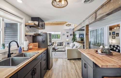 The kitchen features a center-island to seat 4-6, stainless appliances, large pantry with plenty of room for your supplies, white dishes & glasses, pots & pans and a cabinet filled with small appliances incl. toaster, counter-top ice maker, blender, crockpot & more! Complimentary coffee/bar with Keurig plus a small regular coffee maker! We provide k-cups, coffee, tea, hot chocolate, creamer, mugs, wine/cocktail glasses, and a small beverage refrigerator ready for you to fill with all your favorite beverages.