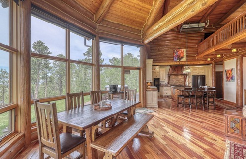 Luxury vacation home located in the Lead/Deadwood area of the Black Hills. Elegance surrounds you in this two story, 4,000 Sq.Ft, cabin with spacious 5 bedroom, 3.5 bath, with open loft. Cabin sleeps 1 to 12. Located on a serene wooded lot with panoramic views, surrounded by tall pine and birch trees. Cabin is nestled on 4 acres with abundant wildlife, spotting of turkey, deer, fox and birds.