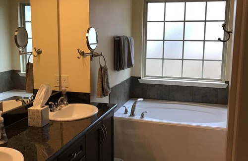 Bedroom 1 (Master Bedroom): King sized bed with linens. Flat screen TV. Adjoining bathroom with soaker tub and shower, 2 sinks.