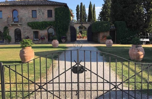 Farmhouse with pool in Tuscany. Located in an ancient sixteenth-century residence built by Carlo Lodovico de ’Piccolomini, whose skilful restoration has kept intact the charm and charm of a past rich in memories. Located on the natural bastion that closes the Valdichiana to the south, the structure is immersed in the tranquility of a centuries-old park: a maze of box hedges, a typical Italian garden, winds through severe cypresses and tall cedars. Numerous comforts - a panoramic swimming pool, tennis courts, reading and meeting rooms - offer guests all the comforts of an unforgettable and exclusive holiday.