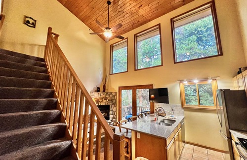 Perched a block from the vibrant downtown of Grand Lake, this beautiful retreat will be just the place for an unforgettable vacation. With high ceilings, warm wood paneling, and a stone gas fireplace, you will get a taste of that rustic cabin feel while still having all of the conveniences of a modern getaway. Cook memorable meals in the open kitchen complete with all the major appliances of home while everyone reminisces at the breakfast bar with a favorite show playing on the flatscreen TV. After a long day of lake activities, there is no better way to settle down than stepping out to the balcony for a glass of wine at the table set for four as the sun goes down.
