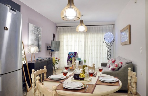 Alexandra's relaxing suite is a nice-decorated,fully equipped and air-conditioned apartment in the beautiful and famous area of Kalamaki near by the sea.Placed in the ground floor of a residence's complex Alexandra's relaxing suite is the perfect destination for everyone who seeks a comfortable staying in a beautiful place by relaxing and reading a book at cozy sofas or enjoying a drink at swimming pool.The apartment is in a quiet neighbourhood with plenty of super markets and restaurants around,but also in the middle of all interesting destinations of Chania.Only 150m from the nearest sandy beach,500m from the popular sandy beach of Agious Apostolous,1.5km from cosmopolitan day and night clubs and beach bars of Agia Marina and Platanias,5 km from the town of Chania with the old Venetian harbor,the picturesque alleys,the Old municipal market,Firka fortress,Archaeological,Byzantine,Nautical museums and many more and 25km from Daskalogiannis airport of Souda.Ideal for couples and just-married! A welcome gift including water, homemade olive oil, wine and raki is offered at the accommodation.