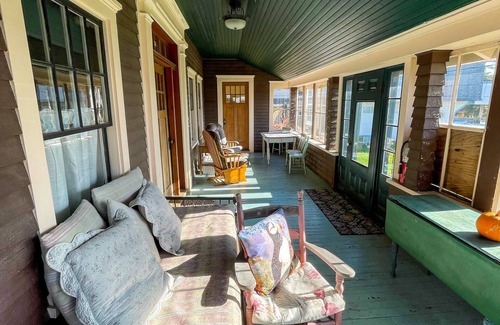It's a lovely house — a traditional Maine summer house with an enclosed front porch overlooking the village and the waterfront. Of course, the windows open (with screens) to create a screen porch atmosphere. Find rocking Adirondack chairs and a table and chairs for morning coffee or a casual dinner as the sun sets.