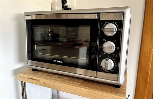 You will find both a microwave and an electric oven, a very large XXL shower, ironing board, crib and high chair on request, and a reading chair.