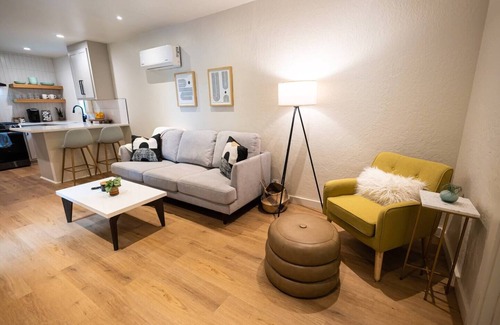 This tiny house is ideal as a romantic getaway or a staycation. You’ll enter the property on an alley and go over a bridge to your private secluded escape! This home is 518 sq ft but big on luxury after a complete gut reno recently. Open concept kitchen/living area with its own split heat and air system. A brand new memory foam mattress awaits you in the large bedroom, also with its own split system and smart TV. The bathroom is cozy, chic, and stylish and has everything you need to relax. Any vehicles larger than standard cars and SUVs may have trouble driving down the alley.