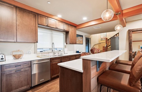 A beautiful primary bedroom boasts a private bathroom ensuite, gorgeous views, and is finished in warm, neutral tones for a soothing respite at the end of the day. The upper level of the villa features a playful ski-themed guest room with two Queen beds and shares a full bath with the adjacent home office and den with comfy seating.