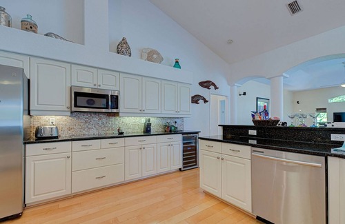 Score big at the new Foosball Table in the Living Room. Spacious Family Room with black leather sofas, coffee and side tables, entertainment center with 75 inch TV, Bose sound system. It's every chef's dream kitchen with stainless appliances, stone counters and bar with gorgeous pearl shell backsplash, bar stools, wine cooler and pantry. Morning nook with mocha color high bistro set with 4 chairs with aquarium windows overlooking pool area. Formal dining with Tommy Bahama style large table and 6 chairs.