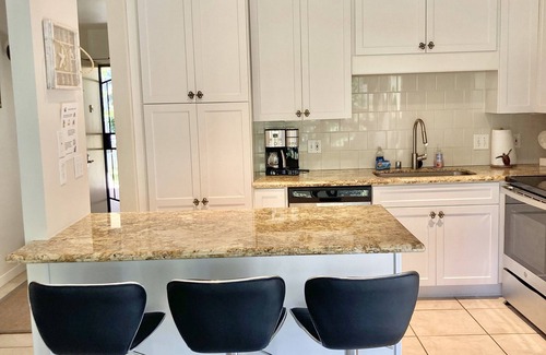 The master bedroom features a NEW (6/22) King size bed furnished with nightstands and dresser, a wall mounted smart HD TV, split a/c & a sliding glass door to enjoy the extra breezes and heavenly scented blossoms on the Plumeria tree. An upstairs loft-style bedroom w/ high quality full sized beds has split A/C and is fully equipped with its own bathroom. A roomy, screened-in lanai overlooks one of Kuilima Estates swimming pools with views of the lake, swaying ironwood trees and the azure Pacific beyond which is under a 10 minute walk from this condo. Fashionable granite counter tops highlight the newly remodeled kitchen equipped with all new refrigerator, stove, dishwasher, microwave, coffee maker, blender, plus all cooking and dining necessities. Eat inside at the kitchen island with barstool seating for 3 or while enjoying the breezes and view from the lanai which overlooks the golf course. Laundry amenities include brand new full washer/dryer, ironing board and iron. One assigned parking space is provided, as well as additional guest parking spaces. Tennis courts and swimming pools are within the condo complex; as well as a BBQ grill.
