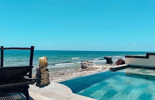 Casa Luna Azul - Experience Isla Mujeres from this incredible 4 bedroom oceanfront home directly on the beach with heated infinity pool. Large indoor/outdoor living area with an open floor plan. 360° view of amazing sunrises and sunsets. Indoor/outdoor dining. Perfect mid-Island location. Large gourmet kitchen. You will have direct access to the beach through your private (lockable) gate. Walk the beach in the morning looking for shells. Listen to the waves crash at night as you enjoy your drinks by the pool. Watch the dolphins play in the Caribbean and the tortugas come in to nest on the beach in front of the casa. Casa Luna Azul is owner managed and no detail is left untouched. We can help you arrange transportation to and from the airport, excursions, hire an in-house chef or masseuse, babysitting. We can pre-stock the kitchen before your arrival. Anything you need to make your vacation perfect, we are here to help.