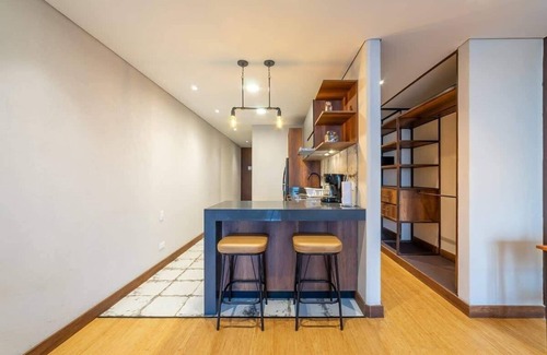 This stylish studio in Bogotá's historic La Candelaria offers a complete full kitchen with a kitchen bar, perfect for those who enjoy sharing meals and cooking together. The space is thoughtfully designed to include a comfortable queen-size bed, ideal for couples. With smart lock access, entering the apartment is seamless and secure. Guests will also benefit from the building's amenities, including an on-site barbershop, gym, and a variety of restaurants, ensuring a convenient and enjoyable stay. Whether you're exploring the cultural landmarks or simply relaxing, this apartment provides the perfect blend of comfort and modern amenities in a prime location.