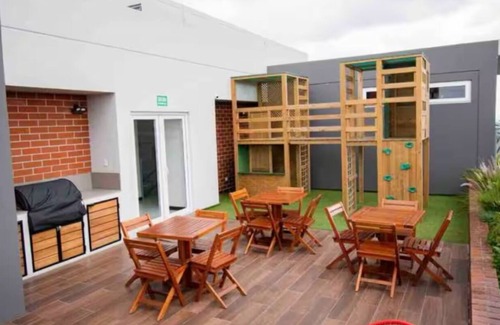 El edificio cuenta con gimnasio y terraza al aire libre con pequeño juego de niños y churrasquera.