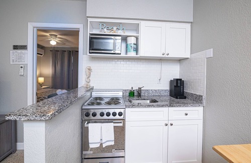 Intracoastal waterfront, steps from sugar WHITE SAND beach with FREE parking. Fully RENOVATED from top to bottom, this 400sf apartment offers a spacious WALK-IN shower, soft/comfortable bed, and full kitchen. Chill out in the COURTYARD or in back by the water after a day at the beach, water sporting fun, or simply exploring the island. For a clean, relaxing, and AFFORDABLE getaway, choose Anchors UP.
