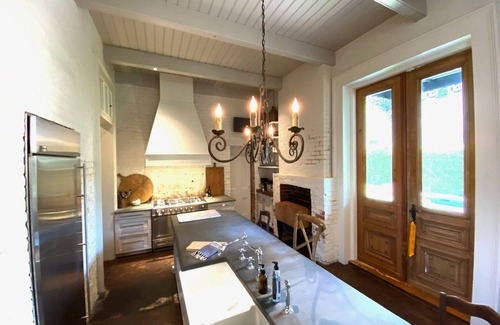 Two large antique French doors on the terrace open to the charming Living Room and Dining Room with very high ceilings and terra-cotta floors and a working fireplace. These rooms are decorated with European antiques and also modern sofas for comfort. Passing through an arched door there is a generous kitchen with tall wooden beamed ceilings, a 14' long stone topped island and painted exposed brick walls. The tall French doors in the kitchen provide beautiful light and great access to the pool just outside. The Kitchen is well equipped with a La Cornue range, Subzero refrigerator, large apron sink and Waterworks faucets. There is also a powder room off the kitchen.