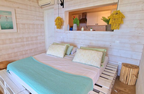The intense Kaz includes, a terrace with magnificent view of the ocean, a standing table for 4 people, a swing bench and two armchairs and coffee table. A new fully equipped kitchen (hob, dishwasher, washing machine, oven, microwave, large fridge, Nespresso, kettle, French press, cookware, complete crockery ...) with a dining area for 2 people. The spacious bedroom, with a 160x200 double bed facing the ocean, an 80 cm flat screen TV with 10 channels to choose from, a wardrobe and a pleasant bathroom with walk-in shower, double sink and separate toilet .
