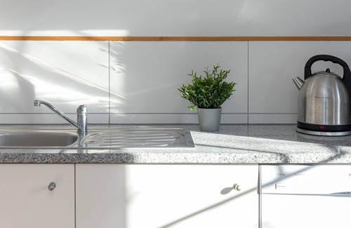 The kitchen is equipped with an oven and a dishwasher, as well as a coffee maker, a microwave, and a toaster. And because there's access to laundry facilities, you can go a bit lighter on your packing.