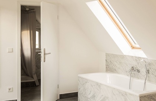 The apartment is on the top floor (3rd Upper floor) of the manor house and is approximately 100 square meters. The apartment is a studio apartment with an open floor plan with a roof terrace, sleeping area, living area, well-equipped kitchen and free-standing bathtub. There is also an extra bathroom. All windows overlook the estate park and the surrounding water landscape.