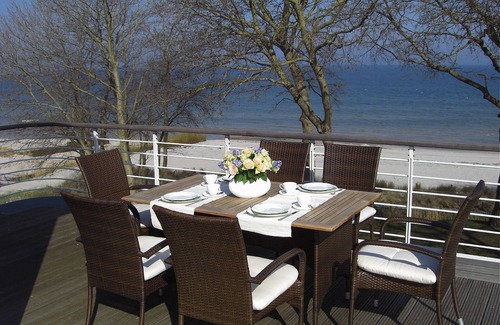 Apartment house by the sea Exclusive apartment right on the sea next to the pier in the resort of Lubmin. From the apartment unobstructed panoramic view of the Greifswalder Bodden. The property has its own beach access. The apartment was completed in autumn 2006 as part of a complete renovation and renovation of the former "Hotel am Meer". Altogether stands in the 2. Upstairs a furnished living area of 135 m², consisting of a large living room (loft character) with fully equipped kitchen (ceramic hob, oven, fridge and freezer, microwave, dishwasher), 2 bedrooms (1 double bed 180 x 200 cm, 1 double bed 140 x 200 cm), a spacious bathroom (2 sinks, shower 100 x 100 cm, toilet) and a small cloakroom and a 45 m² terrace. The apartment is stylishly furnished, all rooms are bright and friendly. Especially suitable for guests who prefer a sophisticated ambience in a privileged location. Bed linen and towels are to be booked when booking, if desired.Arrival: from 15:00 o'clock Departure: until 10:00 o'clock