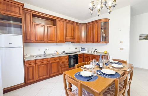 The apartment's bathroom is a small jewel: decorated in a pleasant shade of pink, it is equipped with a comfortable bathtub where you can relax after a long day of sun and sea. To complete the bathroom, an efficient washing machine that adds convenience to daily life, making it easy to manage laundry even during the holidays.