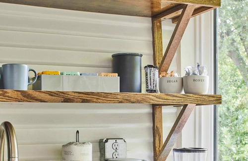 The light-filled kitchenette of apartment 3 is downstairs from the living room and bedroom. Framed by massive windows, overlooking the backyard, you'll love soaking in the sun in this adorable dine-in kitchenette. Stocked for a quick meal -- with refrigerator/freezer, convection toaster, microwave, and kettle -- this kitchenette has your basics covered. Off the kitchen, you'll find the coolest bathroom in town. With stunning geometric tiles and a massive walk-in shower with a seating bench, this bathroom is fun and inviting, and a double vanity offers plenty of room for you and your guests.