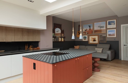 This is a detached house with 3 floors. The heart of it is an open-plan living area with chess-themed kitchen island (fully fitted; induction hob), handmade cardboard, and a reclining sofa. It opens fully to a large paved garden, ideal for enjoying a meal al fresco or doing sports (we have a table tennis and a Swedish ladder; TRX can be fitted).