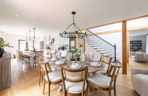 The house, a Cape Cod design, has been newly built with a coastal feel that draws the sea into the house. Shiplapped walls and ceilings, hardwood floors and stunningly furnished for comfort and relaxation. Dining for eight right next to the Chef’s kitchen and kitchen island can make for memorable meal preparation and enjoyment. A wine and beer fridge, ice maker and cocktail shaker set will definitely help set the mood.