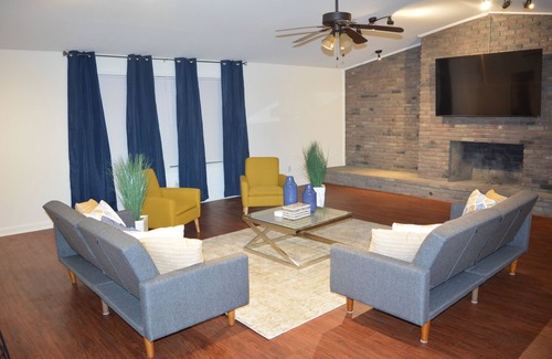 This beautiful 2475 sq. ft. home has 3 bedrooms and 2.5 baths that can accommodate 9 guests. The location of the property is in a peaceful, quiet neighborhood. Only a 10 minute drive to Downtown Augusta, engulfed with an assortment of shopping and dining options. This home features an all brick fireplace with a mounted 75in TV included with numerous entertainment apps, a standard sized pool table, a spacious backyard, and an enclosed patio area, perfect for a relaxing evening. This home comes with a designated workspace, a complete washer/dryer set, and a dining table that seats 4 people. The master bedroom has a king bed, the queen bedroom has a half bath, and the third room has a full-sized bunk bed. Look no further than this hot commodity.