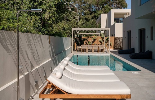 Welcome to Aurea Beach Villa, a brand-new retreat that redefines what it means to unwind. Built in 2025, this airy, sun-soaked villa was designed with a deep appreciation for light, space, and simplicity. Minimalist in style, yet warm and welcoming in atmosphere, Aurea invites you to slow down and enjoy every moment — whether you’re gathered around the outdoor table with wine and laughter, floating in your private pool, or watching the sky shift from blue to gold to violet.