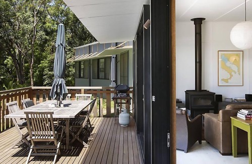 This home was architecturally designed as a modern take on a coastal bush experience, being located in a natural eucalyptus rainforest, with simple, yet stylishly functional areas perfect for one or two families, separated by open air bridges, with the sound of the ocean drifting up through the trees from the beach just minutes below.