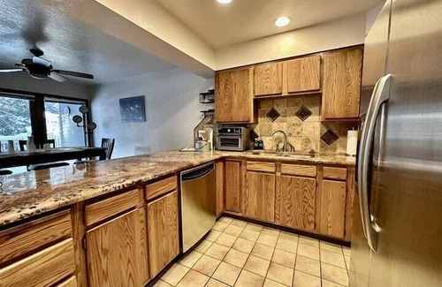 This family townhome is loaded with amenities for all of your guests to enjoy and to make your stay joyous including Air Conditioning. There is a large family living room gathering area with lots of cozy seating and a large 65" TV for your enjoyment. The dining area boasts plenty of seating for making memories. The oversized large patio area overlooks the greens and truly lends the canvas for taking in those warm summer days while providing entertainment as the golfers mastermind the greens on the McCall Golf Course. There are two levels; the main floor hosts one queen size bedroom, while the 2nd floor hosts an open loft area bunk room (one twin/one double) and a primary king suite with a private deck for enjoyment. There are two bathrooms, one on the main floor/laundry room with a stand alone shower, and on the 2nd floor a full size jetted tub with a stand alone shower and dual vanity. All bedrooms have tv's for your enjoyment in addition, comfortable beds, all new linens, pillows and lots of throws for added comfort.