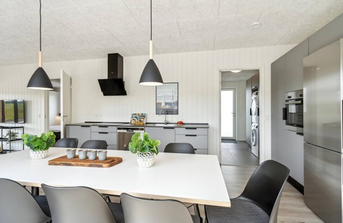 In a wonderful location, surrounded by nature and close to the fjord, this exceedingly comfortable vacation home with space for the large family awaits you. The attractive interior with modern furniture creates a cozy feel-good atmosphere in the rooms. Enjoy meals together with a view of the garden through large panoramic windows and then get the circulation going again with a game of billiards. At the end of a wonderful day, make yourself comfortable together in the living area and chat late into the evening.