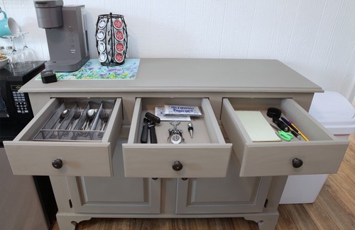 has a mini-fridge, microwave, toaster, and Keurig (a variety of coffees and teas are provided). Utensils, cups, plates, mugs and leaning supplies are stored in the hutch. This space also has a reading nook with a fold-out chair and side-table.