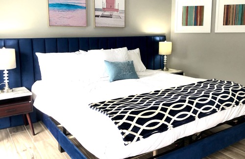 Modern design, new furnishings, new memory foam mattresses, luxurious white beddings, tile throughout entire house for cleanliness. Beautiful new bathrooms. Gorgeous kitchen with all new stainless steel appliances and stocked with basic cookware. Linens and towels provided.
