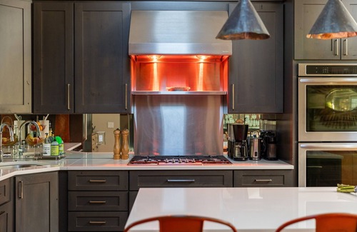 Indulge your inner chef in this fully stocked kitchen, complete with a double oven, five-burner stove, Monogram refrigerator, and all the tools you need to impress your guests. The large island with seating makes it easy to keep the cook company.