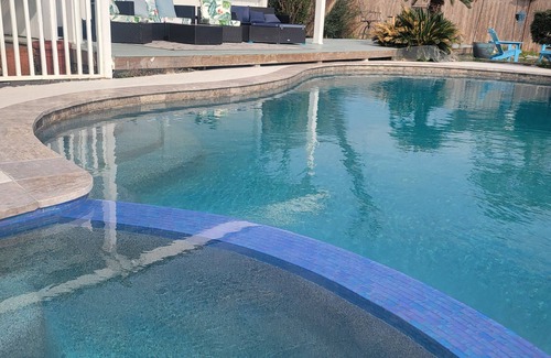 Welcome to our delightful oasis, hidden in plain sight. Our 3 bedroom 2 bath residential home is in a nice established neighborhood. Our home is charming. comfortable, clean and super cute! You can enjoy your morning coffee on the deck in the middle of paradise or relax inside with a view of the private pool.