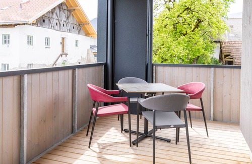 "be balance", 2-room apartment 54 m2 on 1st floor. Modern and stylish furnishings: entrance hall. 1 double bedroom with satellite TV (flat screen). Exit to the terrace, west facing position. Large kitchen-/living room (oven, dishwasher, 4 ceramic glass hob hotplates, toaster, kettle, electric coffee machine, Capsules for coffee machine (Nespresso) extra) with 1 double sofabed (1 x 160 cm, length 200 cm), dining table and satellite TV (flat screen). Exit to the terrace, south facing position. Shower/WC. Heating. Parquet floors. Large terrace 20 m2, south facing position and west facing position. Terrace furniture. Beautiful view of the mountains. Facilities: hair dryer. Internet (WiFi, free). Garage (1 car), height 210 cm. Please note: non-smokers only. Smoke alarm.