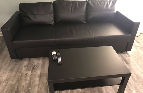Open concept Living room 50' UHD Tv, nice leather couch and counter height table (all furniture is brand new)